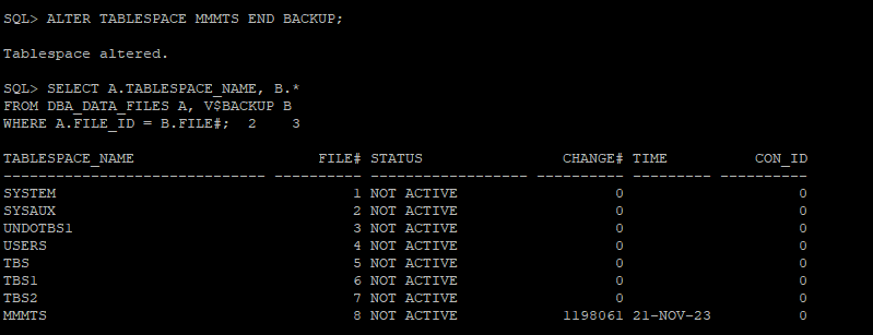MMMTS 테이블스페이스 end backup진행하고 테이블스페이스 확인