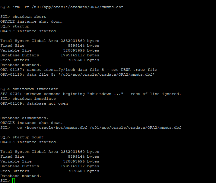 db를 다시 정상종료하고 hotbackup한 datafile 기존위치로 이동시켰다.