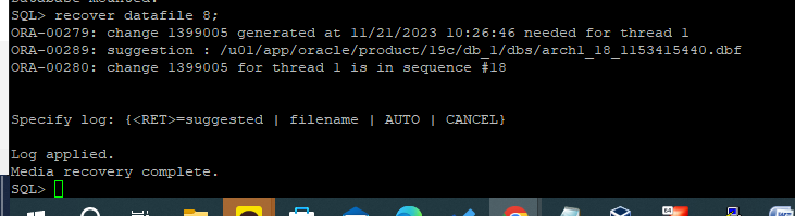 file_id 8번 datafile recover 진행. db open상태로 전환