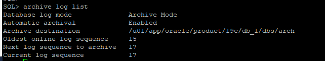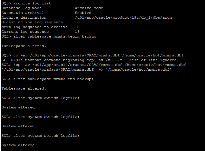 아카이브모드 확인후 begin backup과 endbackup 후 로그스위치를 3번 실행시켰다.